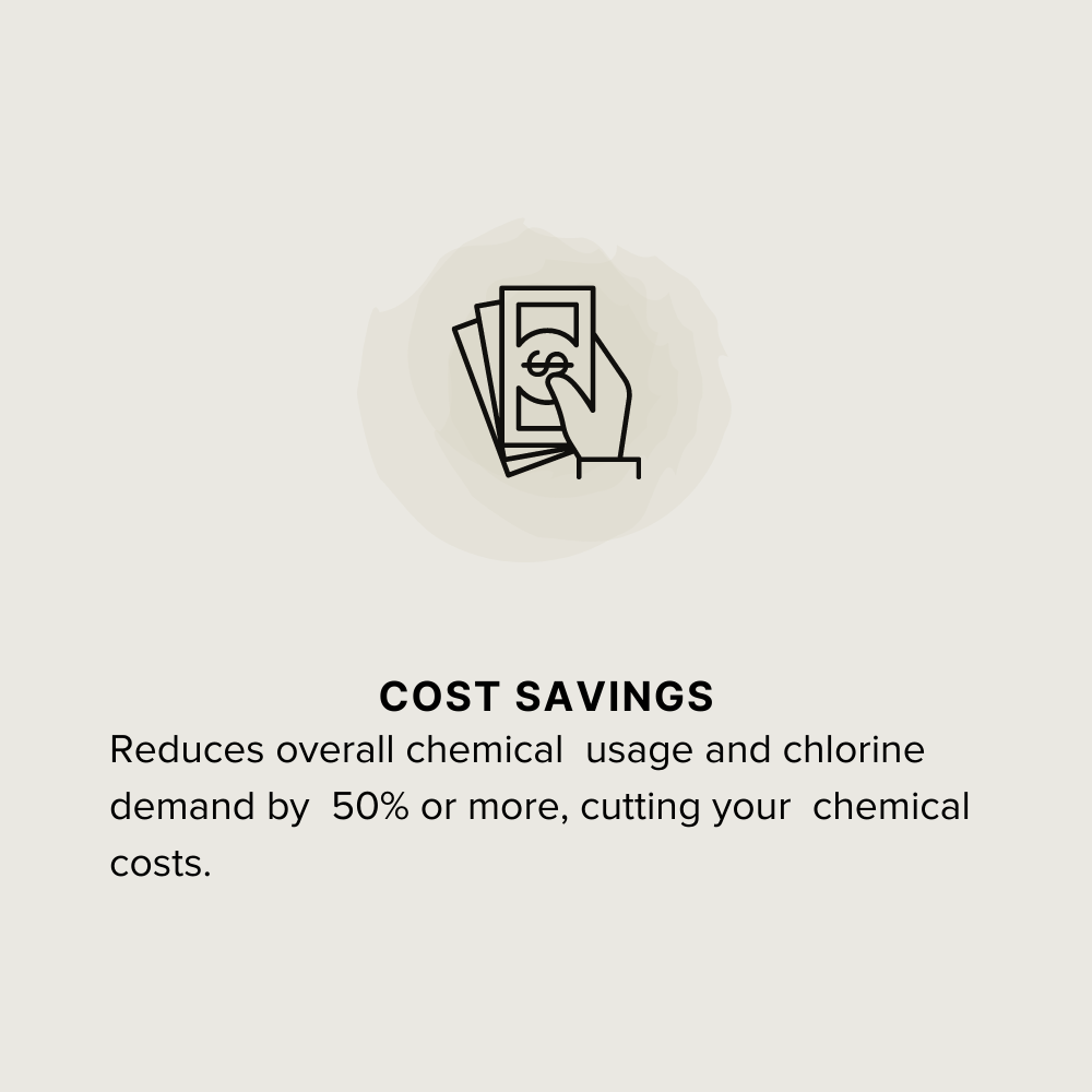 » Reduces overall chemical usage and chlorine demand by 50% or more, reducing chemical costs and extending the life of salt chlorination systems